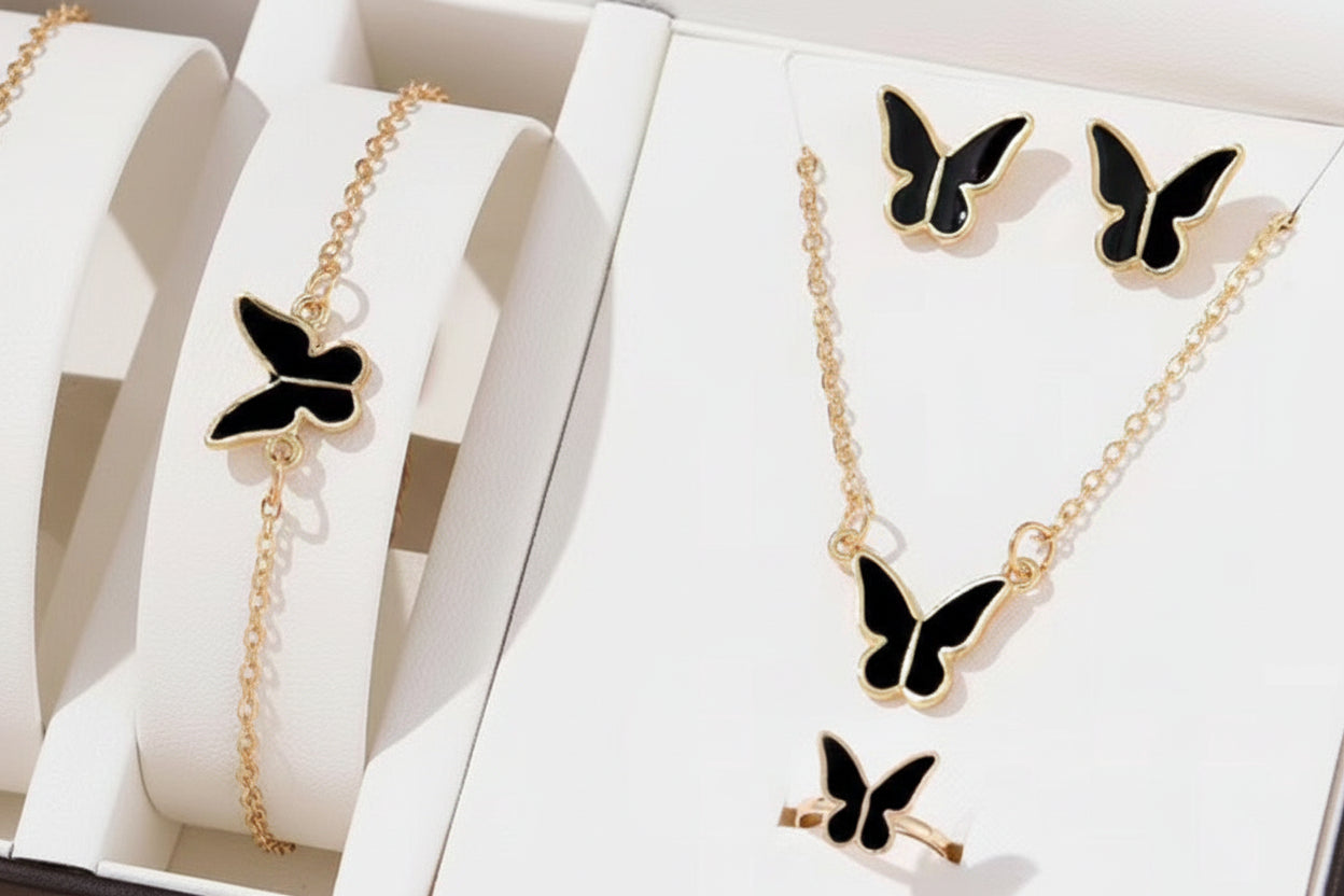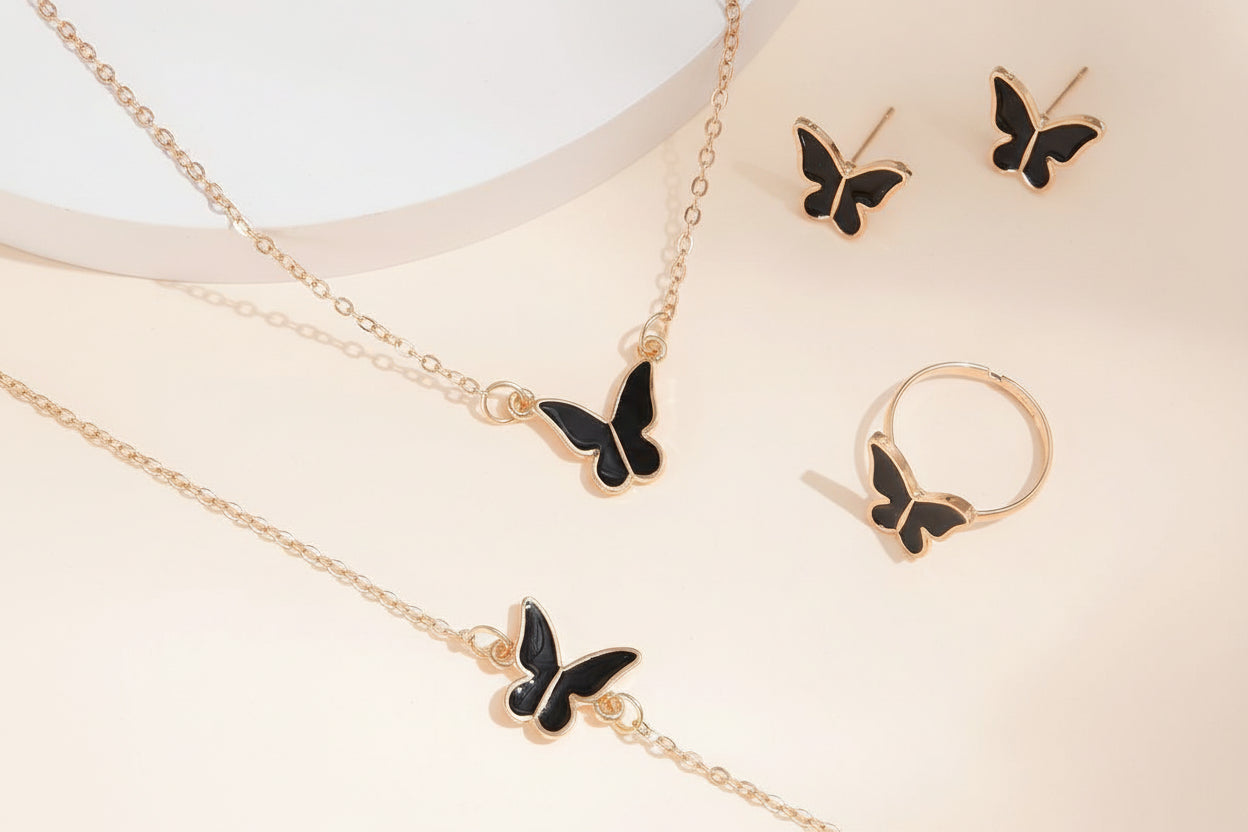 This elegant Butterfly Jewelry Set brings a coordinated, airy touch to any look. Featuring sleek butterfly-shaped charms in glossy enamel, the set includes a matching necklace, bracelet, ring, and stud earrings finished in a warm gold-tone. Choose classic black for chic contrast or soft pink for a sweet, feminine vibe.